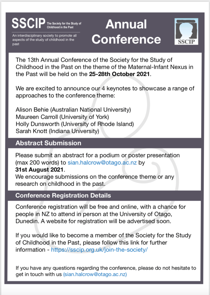 If you are interested in attending any of the eight sessions you can register for free using the following link: https://www.eventbrite.com/e/society-for-the-study-of-childhood-in-the-past-conference-tickets-179748280947. After you register you will be sent a confirmation email. Zoom details for the event can be found by clicking the “View the event” button in this email.